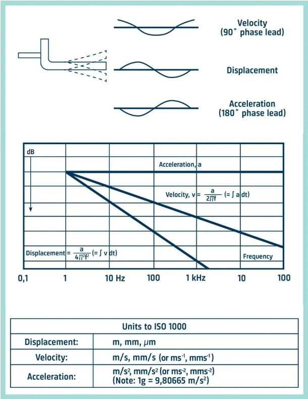 對于正弦信號,位移、速度和加速度幅度通過頻率和時間的函數在數學上相關,如圖所示。如果忽略相位,如在進行時間平均測量時總是這樣,則可以通過將加速度信號除以與頻率成比例的因子來獲得速度水平,也可以通過將加速度信號除以與頻率的平方成比例的因子來獲得位移。這種除法計算在測量儀器中以數字方式執(zhí)行。
