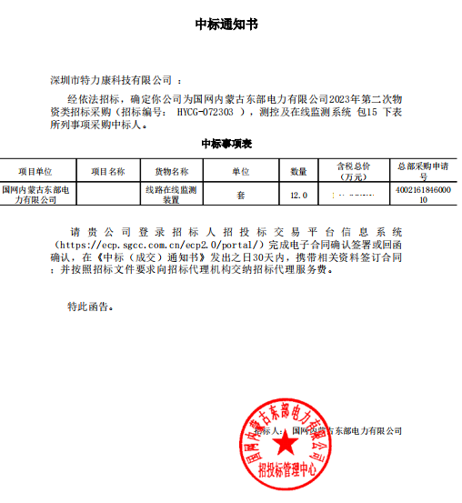 經(jīng)依法招標(biāo),確定我司為國(guó)網(wǎng)內(nèi)蒙古東部電力有限公司2023年第二次物資類招標(biāo)采購(gòu)(招標(biāo)編號(hào): HYCG -072303 ),測(cè)控及在線監(jiān)測(cè)系統(tǒng)包15下表所列事項(xiàng)采購(gòu)中標(biāo)人。中標(biāo)通知如下: