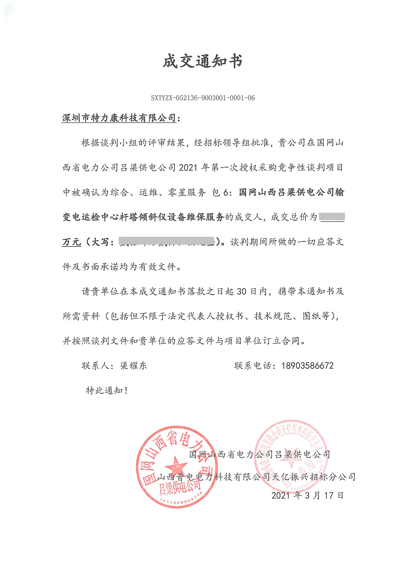 根據(jù)談判小組的評審結(jié)果,經(jīng)招標(biāo)領(lǐng)導(dǎo)組批準(zhǔn),貴公司在國網(wǎng)山西省電力公司呂梁供電公司2021年第一次授權(quán)采購競爭性談判項(xiàng)目中被確認(rèn)為綜合、運(yùn)維、零星服務(wù)包6:國網(wǎng)山西呂梁供電公司輸變電運(yùn)檢中心桿塔傾斜儀設(shè)備維保服務(wù)的成交人,成交通知如下: