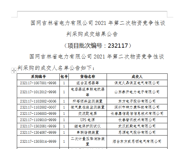 特力康中標(biāo)國(guó)網(wǎng)吉林省電力有限公司2021年第二次物資競(jìng)爭(zhēng)性談判(項(xiàng)目批次編號(hào): 232117)-微氣象在線監(jiān)測(cè)裝置,國(guó)網(wǎng)吉林省電力有限公司2021年第二次物資競(jìng)爭(zhēng)性談判采購(gòu)的成交人名單公告如下: