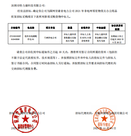 經(jīng)依法招標(biāo)。確定我司為國網(wǎng)甘肅省電力公司2021年+電網(wǎng)零星物資及辦公用品框架招標(biāo)采購項目下表所列事項采購貸物中標(biāo)人。中標(biāo)通知如下:
