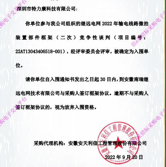 深圳市特力康科技有限公司:你單位參與我公司組織的繼遠(yuǎn)電網(wǎng)2022年輸電線路微拍裝置部件框架(二次)競(jìng)爭(zhēng)性談判(項(xiàng)目編號(hào):22AT13043406518- 001) ,經(jīng)評(píng)審委員會(huì)評(píng)審,被確定為入圍單位。中標(biāo)通知如下:
