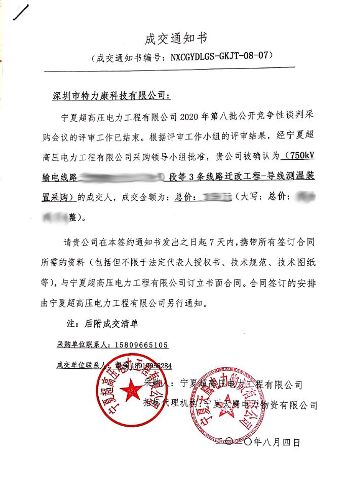 寧夏超高壓電力工程有限公司2020年第八批公開競爭性談判采購會議的評審工作已結(jié)束。根據(jù)評審工作小組的評審結(jié)果,經(jīng)寧夏超高壓電力工程有限公司采購領(lǐng)導(dǎo)小組批準(zhǔn),我司(深圳市特力康科技有限公司)被確認(rèn)為_ (750kV輸電線路中3條線路遷改工程-導(dǎo)線測溫裝置采購)的成交人,現(xiàn)發(fā)布成交通知書如下: