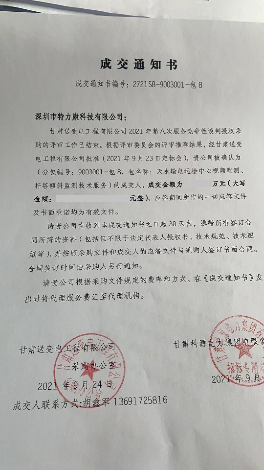 甘肅送變電工程有限公司2021年第八次服務(wù)競(jìng)爭(zhēng)性談判授權(quán)采購(gòu)的評(píng)審工作已結(jié)束。根據(jù)評(píng)審委員會(huì)的評(píng)審?fù)扑]結(jié)果,經(jīng)甘肅送變電工程有限公司批準(zhǔn)(2021 年9月23日定標(biāo)會(huì)),貴公司被確認(rèn)為(分包編號(hào): 9003001-包8, 包名稱(chēng):天水輸電運(yùn)檢中心視頻監(jiān)測(cè)、桿塔傾斜監(jiān)測(cè)技術(shù)服務(wù))的成交人,中標(biāo)通知如下:
