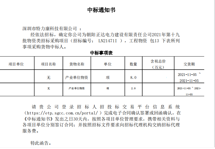 經(jīng)依法招標(biāo),確定我司為朝陽(yáng)正達(dá)電力建設(shè)有限責(zé)任公司2021年第十九批物資類招標(biāo)采購(gòu)項(xiàng)目(招標(biāo)編號(hào): LN21471I )工程物資包,中標(biāo)通知如下: